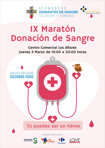 Todo en marcha para el IX Maratón de Donación de Sangre en #Talavera en el Centro Comercial Los Alfares #TalaverayComarcaSíDonan #DonaSangre #DonaVida 3 de marzo de 10 a 20 h. Reserva un hueco en tu agenda!! Descargar cartel informativo.